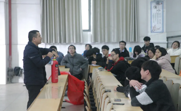 消防安全知识课堂分为理论课堂与实地演练两部分。在理论课堂中,张超教官给普及了同学们的消防安全意识,讲解操作和使用各种工具正确方法,并向师生强调了演练注意事项。