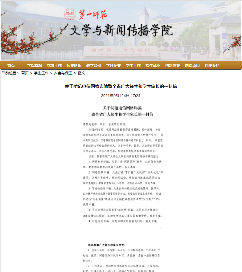 文传院官网上传《防范电信诈骗宣传手册》和《关于防范电信网络诈骗致全省广大师生和学生家长的一封信》