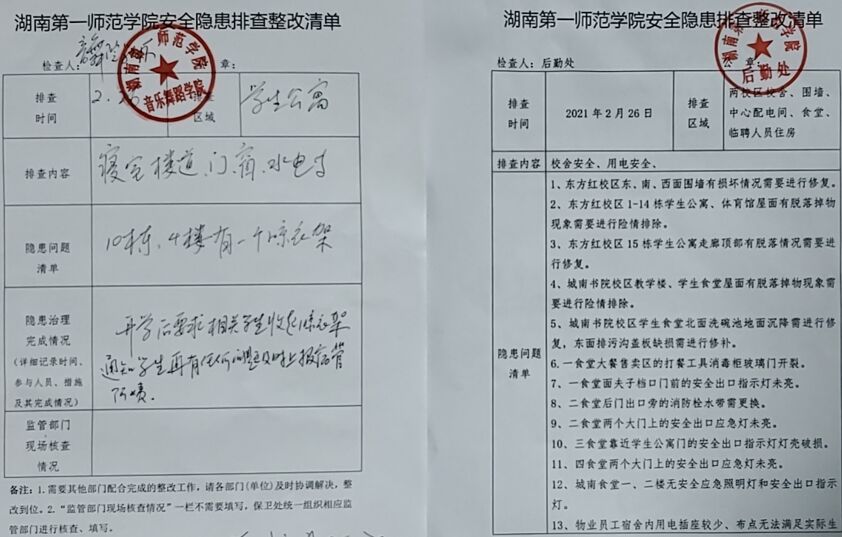 此次安全隐患排查共分为10个小组,主要围绕校园消防安全、实验室及危化品安全、学生宿舍安全、生产生活安全等内容进行排查。从各排查组反馈上交的整改清单来看,各部门、各学院,及天创物业公司的开学工作组织保障实施情况良好,做到了安全排查到位、反馈整改到位、责任落实到位,为确保师生返校复学安全、共筑平安和谐校园打下了坚实的基础,确保了我校教育教学工作的顺利进行。
