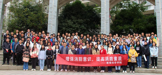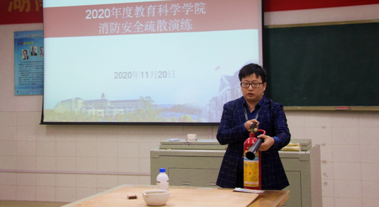 教育科学学院于2020年11月20日中午在玉衡楼南栋举办了2020年度教育科学学院消防安全知识讲座以及消防安全演练。讲座由湖南省会消防安全中心廖成俊教官主讲,教育科学学院张志新书记、教务处实践科科长殷绪彬、学工办主任刘军、实验员黄永亮、全体辅导员、学生干部及各班学生代表受邀参加此次活动。