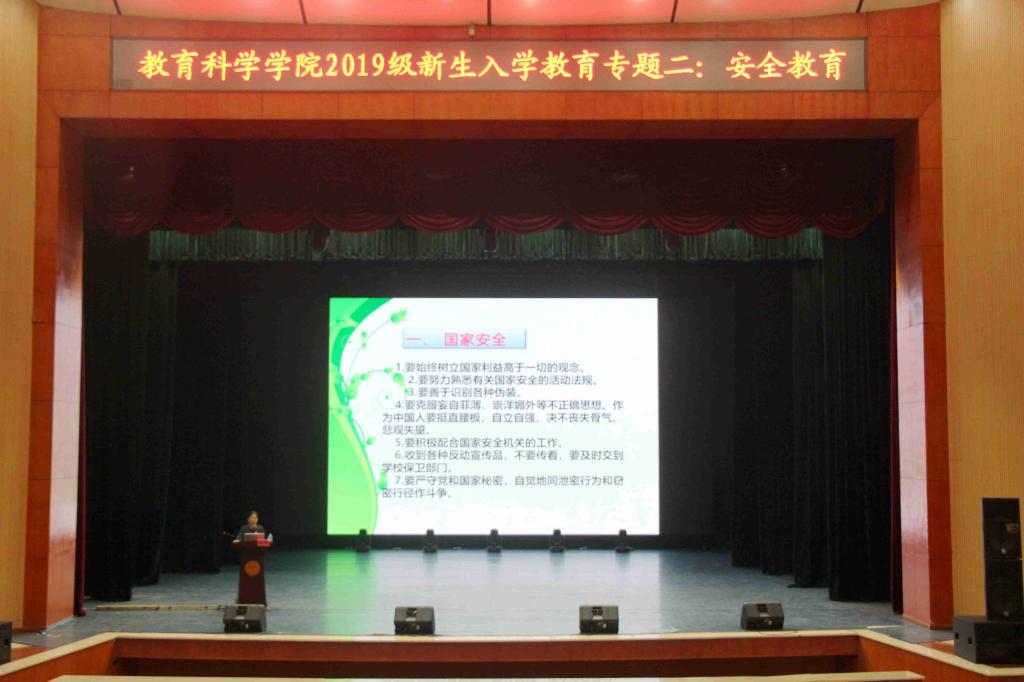2019年9月8日上午,教育科学学院在田汉剧场举办2019级新生安全教育主题讲座。讲座由教育科学学院党总支书记陈天涯担任主讲。我院党总支副书记、院长胡春光主持。
