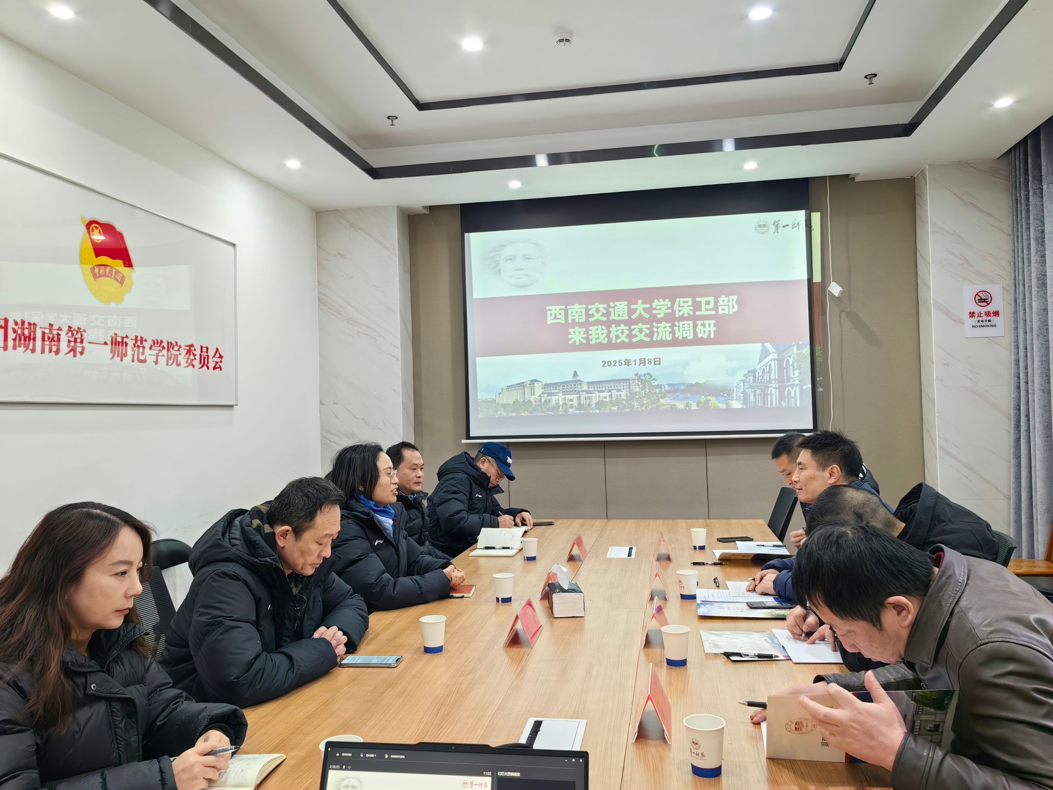 我校保卫部副部长(主持工作)成海英对西南交通大学保卫处同仁的来访表示热烈欢迎,并简要介绍了我校的基本情况和保卫部机构设置、管理体制和人员配备等方面基本状况。详细介绍了保卫部主动适应新形势新要求,强化安全工作“三基”工作理念的开展情况,以及学校安全基础设施、红色资源育人、智慧消防应用等相关经验。随后双方还就消防责任细化、监控室管理等当前校园安全热点问题进行了交流,并分享了各自的经验和管理技巧。
