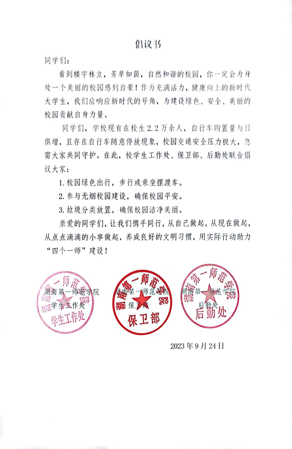 工作动态 您所在的位置: 首页 》 工作动态 》 通知公告 》 正文 倡议书 作者: 发布时间:2023年09月24日 09:36 点击数: 来源: 上一条:BETVLCTOR伟德在线校园交通安全管理规定 下一条:在长高校安全隐患集中排查整治行动方案的通知 关闭