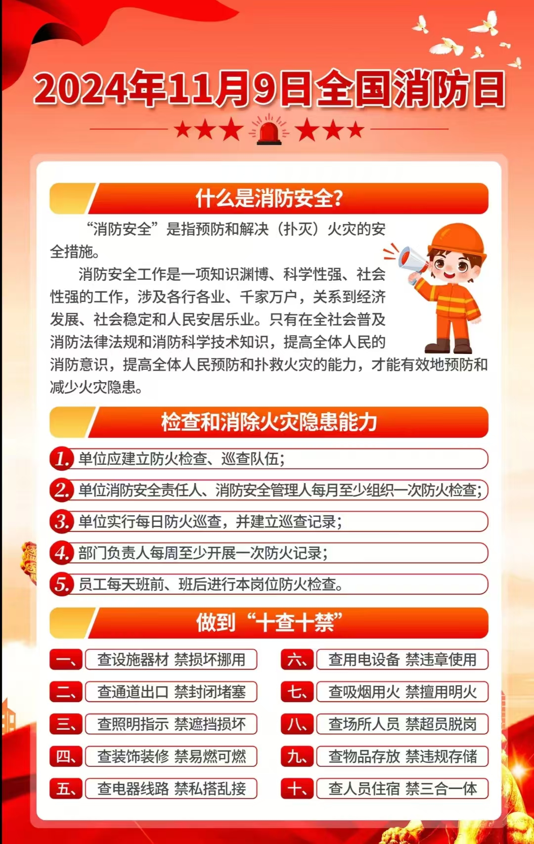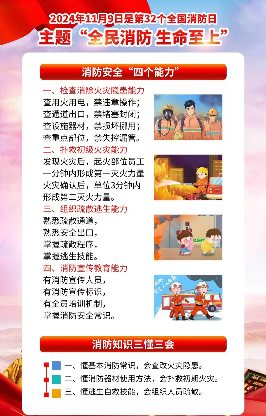 安全教育 您所在的位置: 首页 》 安全教育 》 消防安全 》 正文 2024年全国消防宣传月 作者: 发布时间:2024年10月24日 08:54 点击数: 来源: 上一条:国家消防局2025年消防安全警示教育片《火灾猛于虎 责任重如山》 下一条:清明 | 文明祭祀 谨防火灾! 关闭